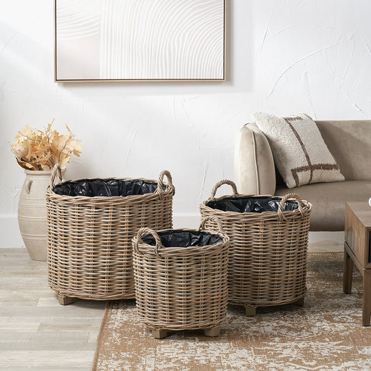 Tobs Set of 3 Indoor / Outdoor Grey Kubu Rattan Round Basket Planters with Handles