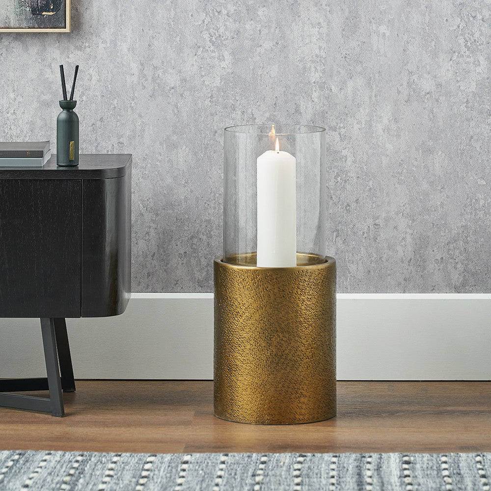 Bring warmth and elegance to your home with the Antique Brass Finish Metal and Clear Glass Hurricane Large. Beautifully crafted in India, this statement piece features a sophisticated antique brass metal base paired with a clear glass surround, perfect for showcasing a large pillar candle. Whether placed in your living room, hallway, or dining space, it creates an inviting atmosphere with ease. Thoughtful detailing and a versatile aesthetic make it a seamless addition to modern, rustic, or transitional interiors.