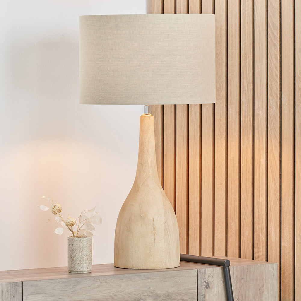 Made in India, this refined Mango Wood table lamp base features a minimalist Natural finish, imparting a subtle yet stylish ambience to any Scandi-inspired space. Its tall, curved structure not only serves as an optimal lighting solution but also delivers a contemporary statement with its sleek design. Recommended lampshade size 40cms diameter. Thoughtful detailing and a versatile aesthetic make it easy to style across modern, rustic or transitional schemes.