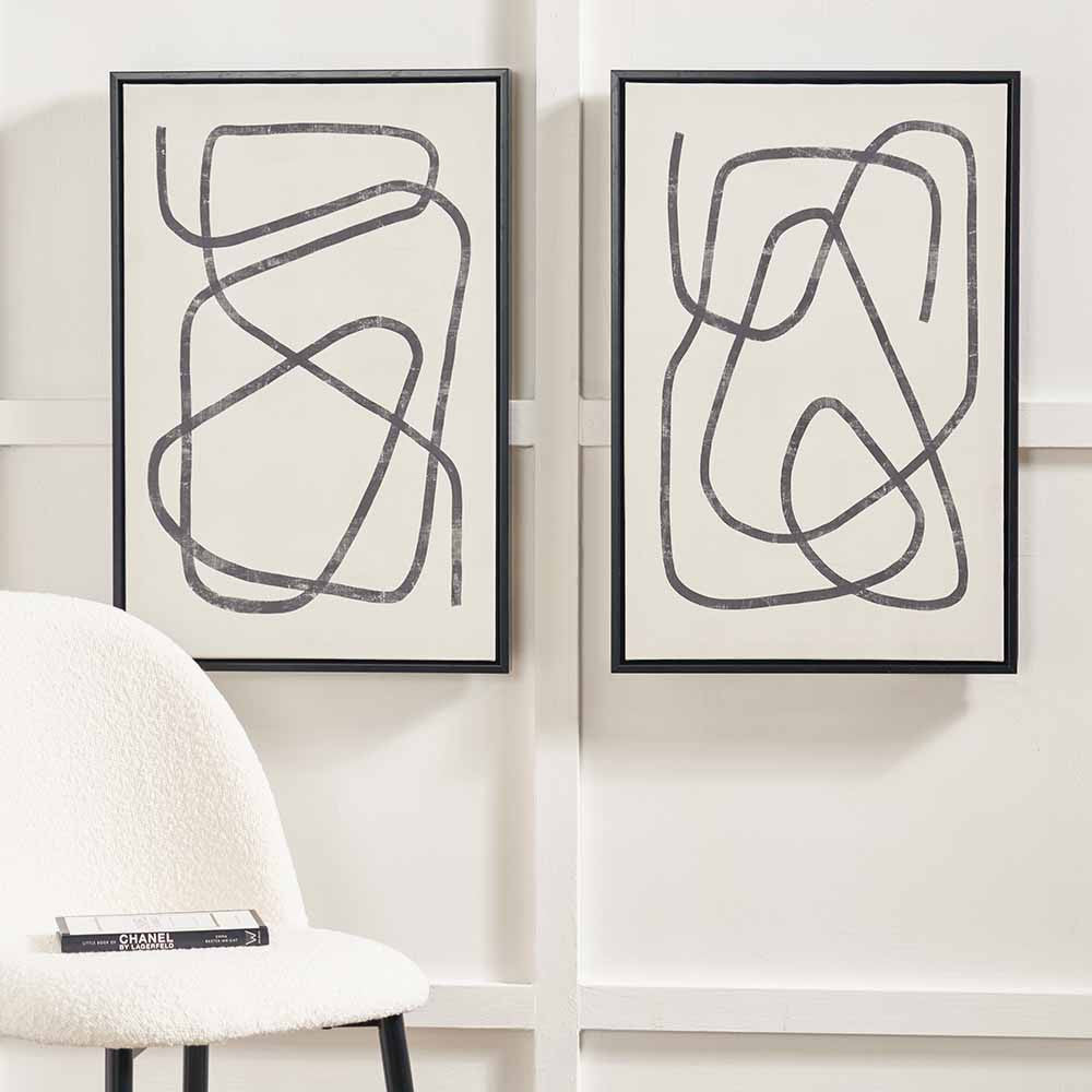This set of 2 black squiggle print canvases brings a modern, minimalist charm to your interiors. Featuring abstract squiggle patterns in a striking monochrome palette, they offer a simple yet impactful way to elevate plain walls. Each piece is accentuated with a black recycled poly frame, ensuring a polished and versatile look that fits seamlessly into contemporary, rustic, or transitional décor. Display them together for a cohesive statement or separately to add style across multiple spaces.