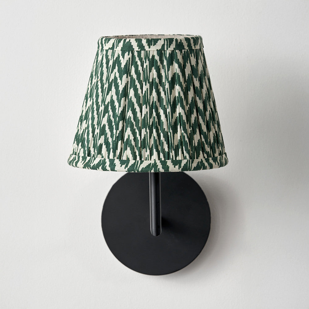 The Vienna 16cm Forest Green Chevron Mushroom Pleat Lampshade pairs a bold pattern with expert detailing to deliver refined style in a compact form. Made from premium cotton, it showcases a striking forest green and natural chevron print, softened by delicate mushroom pleating that adds depth and artisanal texture.